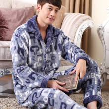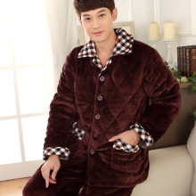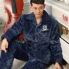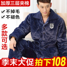 冬季加厚加绒珊瑚绒夹棉男士睡衣男冬天保暖三层法兰绒棉袄家居服
