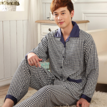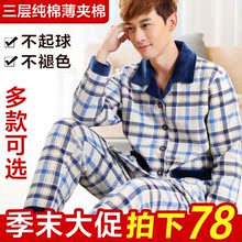 秋冬季纯棉男士睡衣三层薄夹棉优质全棉秋季加厚版长袖家居服套