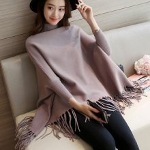 纯妞 秋冬新款韩版女装宽松大码蝙蝠袖高领保暖下摆流苏 披肩毛衣