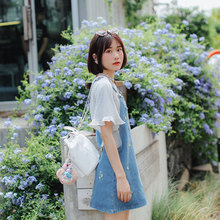 瞌睡兔 清新刺绣吊带连衣裙牛仔背带裙女2017新款夏学院风短裙