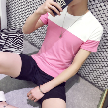 夏季学生拼接圆领短袖T恤男青少年修身日系体恤半袖上衣服潮男装