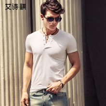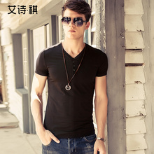 艾诗·祺莫代尔短袖T恤 男士半袖修身紧身个性小v领排纽扣潮款T恤