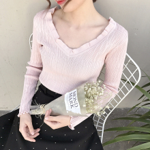 韩版木耳边后背交叉V领修身长袖打底衫毛衣针织衫女套头内搭上衣