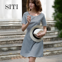 Siti Selected2017春夏新款一字领黑白条纹连衣裙短袖简约A字裙女