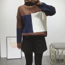 宽松大码毛衣女秋冬季2016新款外穿拼色格子半高圆领长袖针织衫潮