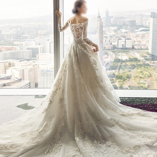 婚纱礼服2017夏季新款中袖一字肩拖尾新娘结婚韩式显瘦简约长袖
