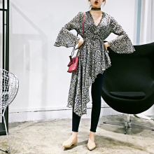 【EC】2017春夏新品 交叉V领斜下摆喇叭袖松紧腰碎花连衣裙 女C21
