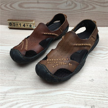 外贸新款夏休闲男沙滩鞋头层牛皮真皮凉鞋橡胶软底手工凉鞋潮