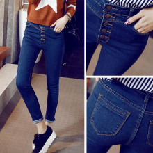 秋季韩版蓝色排扣高腰牛仔裤女修身显瘦弹力小脚休闲铅笔长裤子潮