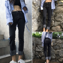 韩国东大门chic秋季新品弹力牛仔裤女直筒卷边长裤学生宽松潮BF风