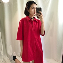 夏季新款原宿风POLO领纯色连衣裙女学生不规则下摆中长款短袖T恤