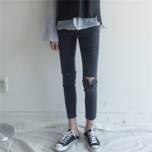 春装女装韩版弹力高腰破洞修身牛仔裤百搭铅笔裤九分裤休闲小脚裤