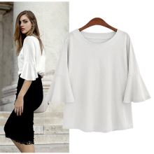 2017韩版春夏装五分袖t恤女喇叭袖上衣中袖打底衫宽松体恤衫黑色