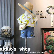 喜多家童装2017夏装新品女童可爱香蕉草莓短袖T+牛仔短裤两件套装