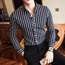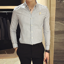 马卢达秋季韩版男士修身衬衫 潮男竖条纹长袖衬衣青年薄款打底衫