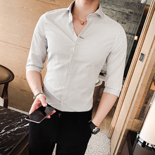 马卢达夏男士七分袖衬衫青年英伦修身条纹短袖衬衣男韩版中袖衬衫