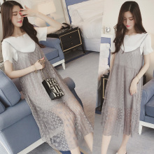 2017夏季新款胖MM压褶雪纺+蕾丝钩花吊带连衣裙两件套女加肥加大