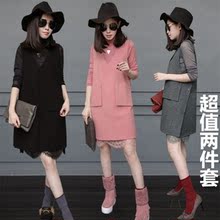 欧洲站2017春季女装蕾丝长袖打底衫加厚两件套装中长款毛呢连衣裙