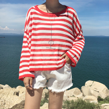 2017夏季新款超薄冰丝横条纹T恤女针织半透明宽松喇叭袖罩衫防晒