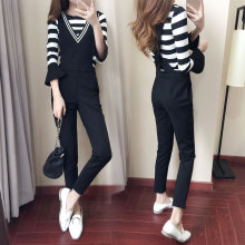 时尚套装女2017春季新款韩版气质条纹T恤+背带连体长裤休闲两件套