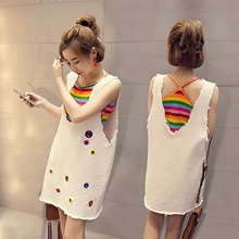 2017夏装新款韩版大码宽松棉麻小清新学生短袖拼接白色连衣裙子女