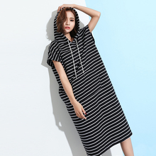 2017蔷薇欧美风女抽绳条纹t裙连帽大码宽松直筒休闲连衣裙显瘦夏