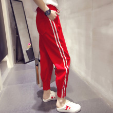 2017夏季韩版新款 显瘦红色松紧腰小脚九分裤两条杠收脚运动裤女