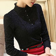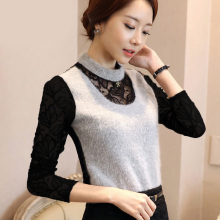 加绒加厚蕾丝衫女2016秋冬装新款韩版女装立领修身上衣长袖打底衫