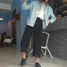 夏季女装韩版新款宽松纯色直筒高腰流苏边大码松紧腰九分休闲裤潮