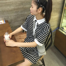 港味复古学院风百搭撞色POLO领经典黑白条纹宽松短袖连衣裙