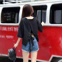 夏季韩版小心机性感镂空露背绑带纯色上衣女宽松显瘦五分袖T恤潮