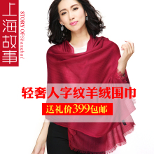 上海故事女士秋季长款纯色百搭大红色人字纹羊绒围巾冬季披肩两用