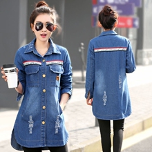 2016春秋韩版破洞镶钻长袖牛仔衬衫宽松大码字母中长款风衣潮女装