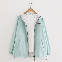 秋季小清新手绘两面穿宽松大码连帽长袖学生风衣外套女简约上衣