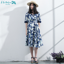 阿尤原创女装2017春夏新品复古田园修身印花连衣裙中裙D1521809