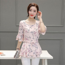 雪纺衫中袖女2017夏季韩版宽松中长款印花大码碎花收腰短袖上衣潮