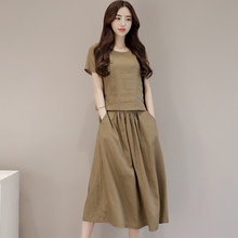 棉麻女装短袖圆领两件套连衣裙2017夏新款文艺显瘦A字裙套裙套装