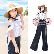 欢乐颂2刘涛明星安迪同款白色荷叶边露肩雪纺上衣+阔腿长裤套装女