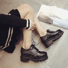 2016秋冬新款韩版漆皮系带粗跟单鞋 厚底松糕鞋女 布洛克雕花女鞋