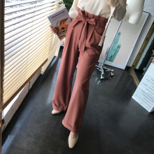 量訫原创2017春新款百褶阔腿高腰裤子女宽松休闲直筒卷边腰带长裤