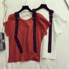 2017夏季新款韩版拼接肩带深v领白色t恤女短袖宽松百搭上衣体恤潮