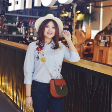 汐悠姿春夏新款大码女装蓝白条刺绣大花衬衫胖mm复古条纹衬衣6081