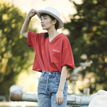 【现货】鹿与飞鸟日系原创文艺宽松全棉V领字母刺绣T恤3色815#