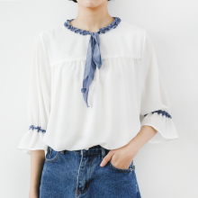 金大班302水木2017春夏新款韩版宽松领带长袖翻领雪纺衬衫女上衣
