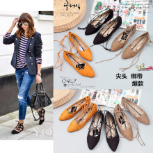包邮韩版绒面浅口尖头绑带平跟鞋系带女单鞋工作鞋潮