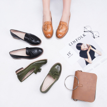 2017春新款英伦风复古软牛漆皮软底中跟蝴蝶结流苏圆头套脚单鞋女