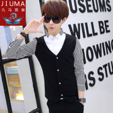 春季修身男士条纹长袖衬衫韩版青少年学生假两件上衣帅气立领衬衣