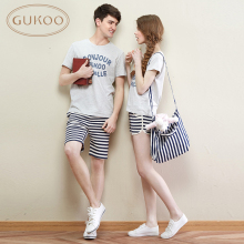 Gukoo/果壳秋季简约字母印花竖条纹裤家居服睡衣情侣家居睡衣套装