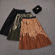 复古百褶蕾丝纱裙拼接金丝绒半身裙中长裙绒面百褶裙