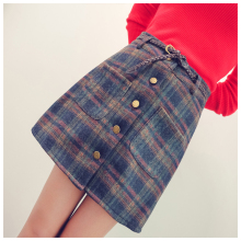 2015秋冬新款厚实毛呢口袋格子短裙包裙A字裙半身裙女送皮带